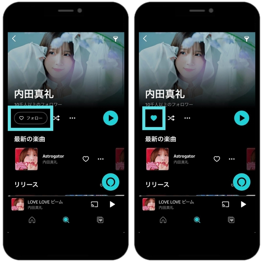 ①対象サービスで内田真礼のアーティストページをフォローもしくはお気に入り登録