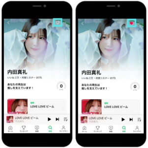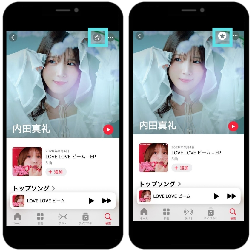 内田真礼のアーティストページ画面右上の☆をタップし、☆内が黒く塗られた上で、☆マー