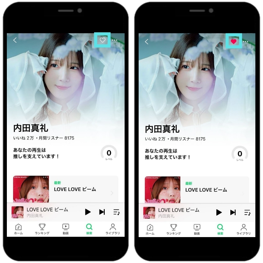 内田真礼のアーティストページ左側にある♡をタップし♡内が青く塗られたことが分かる画面をスクリーンショットしてください。
