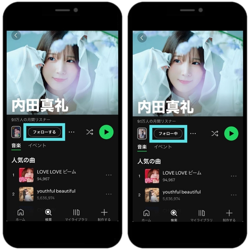 内田真礼のアーティストページで「フォローする」をタップし「フォロー中」と記載のある画面をスクリーンショットしてください。