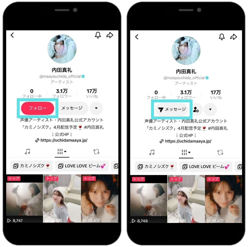 内田真礼のアーティストページ内の「フォロー」をタップし「メッセージ」と記載のある画面をスクリーンショットしてください。