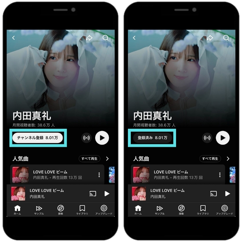 内田真礼のアーティストページ内の「チャンネル登録」をタップし「登録済み」と記載のある画面をスクリーンショットしてください。